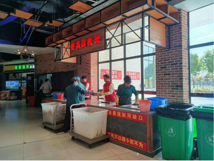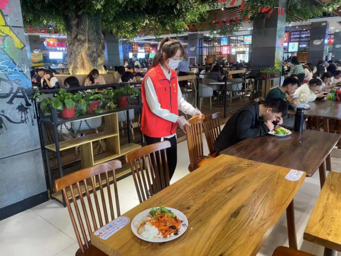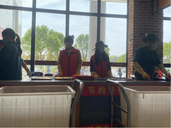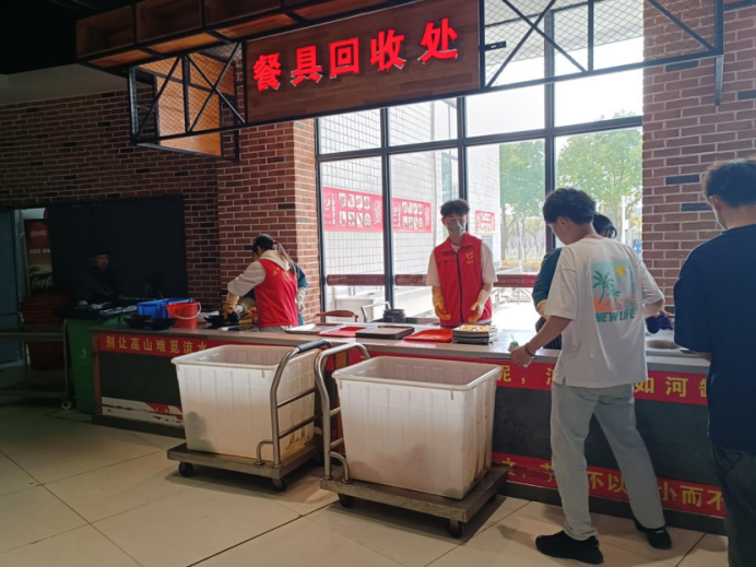 公司青年志愿者协会参与成员统一服装维持就餐秩序,各个小组分工明确,协助食堂清洁阿姨对餐桌上的残留物进行清理,在餐具回收处协助工作人员回收餐具并进行分类。