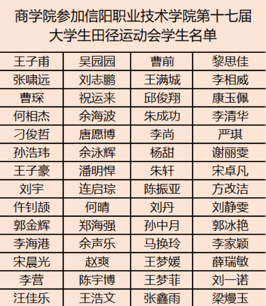 谢丽雯感悟:在这次运动会中我参加的竞赛项目有女子800米和女子4*100米。这次参加女子八百米说实话我没想到自己会是第一名,但事实告诉我付出终将会有回报,坚持不懈的训练终于还是让我得到了回报。刚开始想着弃权女子800米的,因为跟我的4*100米赛程有冲突,但是后来想想这是我来到学校第一次运动会,也是我在校的最后一次运动会,既然参加了,不想给自己留遗憾,说不定就成功了呢!正常发挥出自己的水平,不管成绩好坏。结果没想到,两个赛项都拿了第一,是非常意外的。但我不能骄傲,以后我会继续加油!拿这个奖也非常感谢学院的全体师生为我加油,让我感受到集体的支持是最强大的力量,还有老师的关心。真的谢谢他们的关心与加油!!!