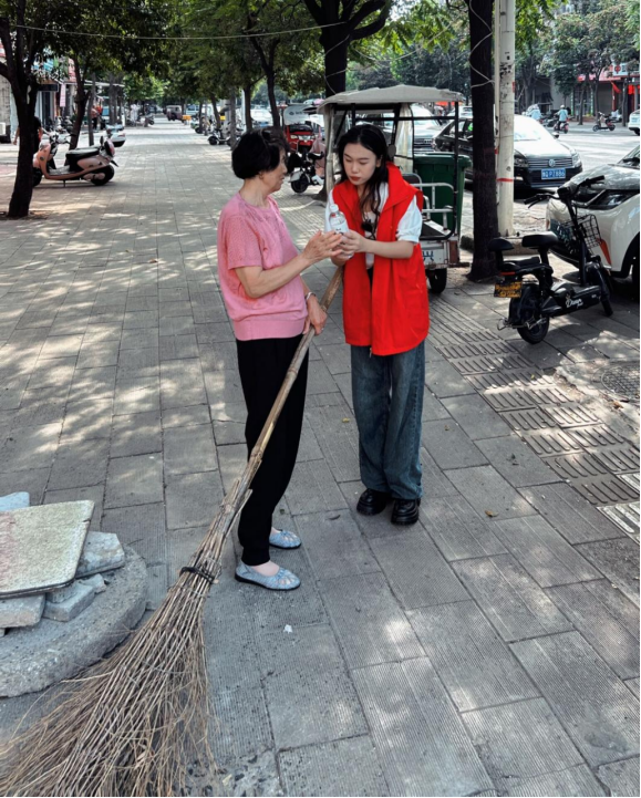 陈怡冰同学在河南省西平县城重渠乡居委会作为老员工志愿者参与2023年“清凉夏天,为爱而行”志愿服务活动。她主要负责的内容是为城市中的各个环卫工人送水。在这炎炎夏日里,送出的水不仅是为环卫工人的身体带来清凉,更慰藉了彼此的心灵。