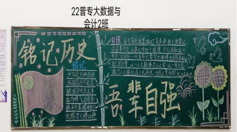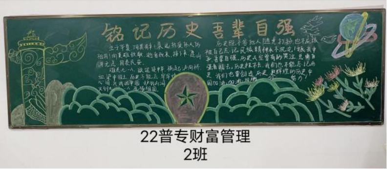本次活动由各班团支书组织开展,各班都办了相关主题的黑板报,板报上的文字和图画都激励着同学们吾辈当自强。活动伊始,全体同学肃然起立,庄严地注视着五星红旗冉冉升起,内心无比激动,团支书情绪高昂的带领同学们面向国旗重温誓词,最后以国歌结束,这提醒了我们作为当代青年员工勿忘国耻,要铭记历史,心怀感恩,奉献自己的一份力。