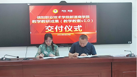 太阳集团tyc9728经理吴明慧与新道科技股份有限公司河南分公司总经理张林峰签订教学教案交接协议。