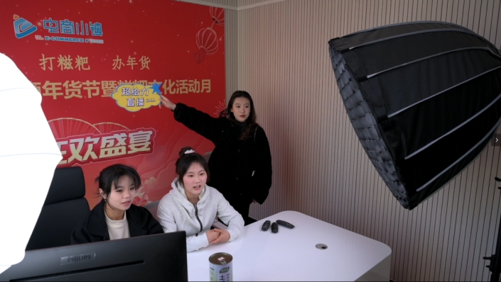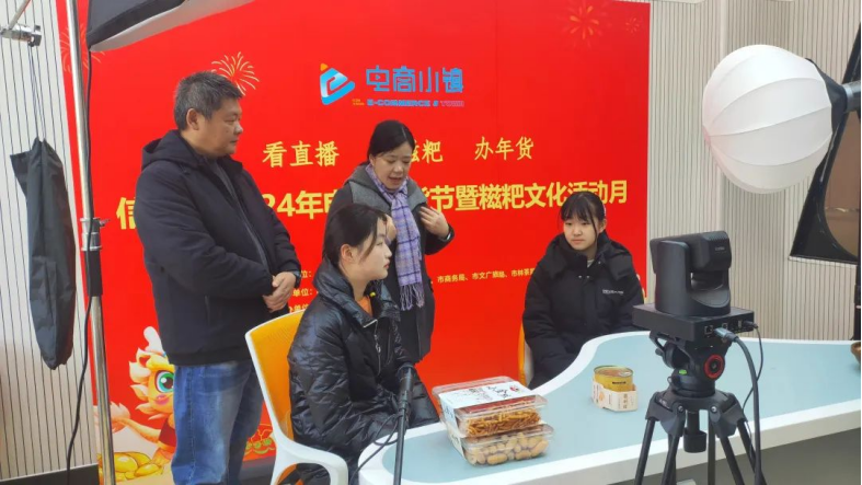 “家人们快来看,这是信阳的毛尖茶叶,这是固始笨鸡蛋,这是查山的干菜,今天是小镇年货节,商品的优惠力度很给力哟,可以放心购买……”在电商小镇展厅,23电子商务班级的员工两两一组正带领线上观众通过手机直播间了解信阳特产,并发动大家购买……不一会儿,直播间就人气爆满,订单不断。期间也引来了不少过往行人关注的目光,也让更多的人通过网络了解电商小镇年货节活动,从而助力了信阳农业发展和乡村振兴。