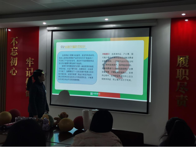 为了提高老员工反诈骗意识,申城支行理财经理还结合诸多实践案例向同学们以示警醒,并通过互动小游戏增强员工们的参与感,使大家有更深刻的体会。另外,提高反诈骗意识的同时,还向同学们介绍了征信的相关知识,强调了保护征信的重要性,即“不仅要做到不被骗、更要做到不骗人”。