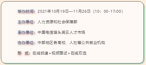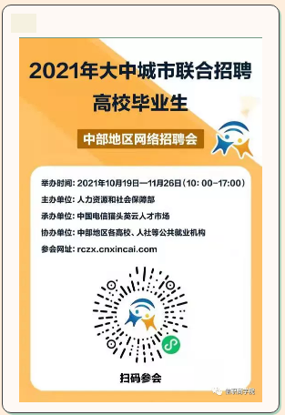 为进一步促进共享就业行动,由人力资源和社会保障部主办的2021年大中城市联合招聘高校毕业生中部地区网络招聘会,于2021年10月19日-11月26日,在全国性共享就业平台中国电信猫头英云人才市场举办。此为公益性共享就业活动,邀请中部地区各高校、人社局等公共就业单位参与,共同促进毕业生就业工作开展!