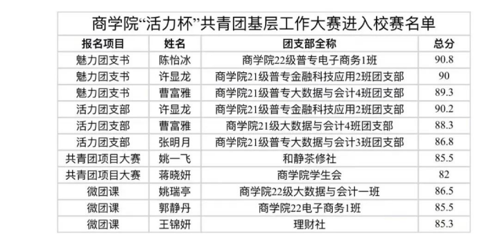 通过激烈角逐,太阳集团tyc97282023年度“活力杯”共青团基础工作大赛圆满结束,以下是进入校赛的选手: