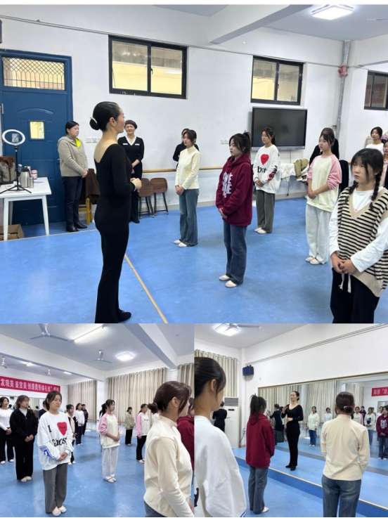 伴随着活跃的课堂氛围,员工们跟随老师一起练习了标准站姿,颈部及肩部训练。员工在老师的指引下伴随着轻快的音乐,反复练习,梳理形体动作,老师会指出员工不标准的动作,同时也会鼓励员工要学会坚持。在专业老师的指导下,员工们认真揣摩动作,反复训练。